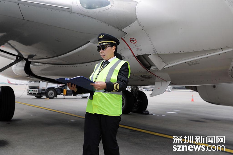上午8時,航班起飛前,飛行員崔陽按程序開展航前飛機檢查工作(涂勝 攝)