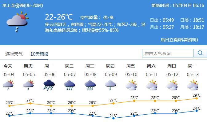 深圳特區(qū)報2019年5月4日訊(記者 方勝)深圳市氣象臺預計,4日我市多云,可見陽光,局部有短時陣雨,氣溫21-26℃,中午前后體感微熱;5-8日我市將出現(xiàn)強降雨,日雨量最大可達暴雨,部分時間伴有雷暴和短時大風;展望9日降雨減弱。5日起我市連續(xù)多日有強降雨,請市民及時關注最新預警預報信息。