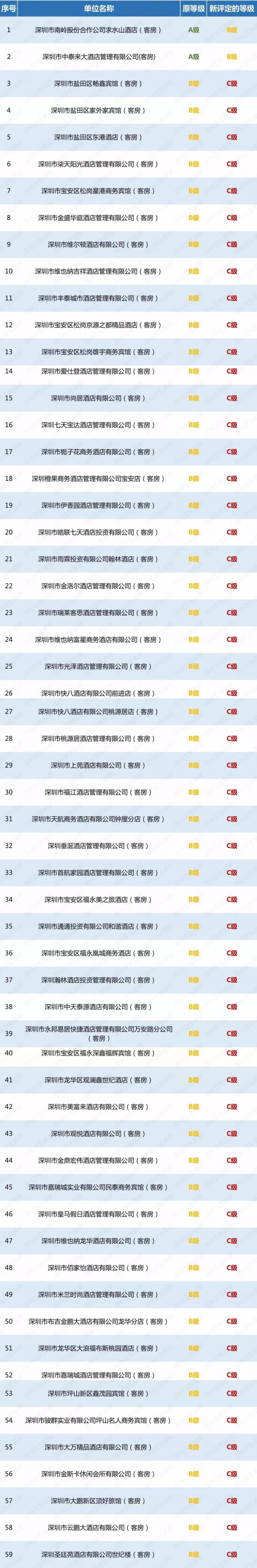 深圳新聞網(wǎng)2019年5月6日訊(記者 劉夢(mèng)婷)日前,記者從深圳的衛(wèi)監(jiān)局獲悉,為保障市民和來(lái)深旅客的健康權(quán)益,自2018年12月下旬開(kāi)始,深圳市衛(wèi)生監(jiān)督部門(mén)集中開(kāi)展專(zhuān)項(xiàng)整治行動(dòng),行動(dòng)中共檢查1660家酒店業(yè)單位,責(zé)令限期整改224家,立案95宗,共有59家單位在衛(wèi)生信譽(yù)等級(jí)評(píng)定復(fù)審工作中,被予以“降級(jí)”。據(jù)了解,2家原衛(wèi)生量化A級(jí)單位被降為B級(jí),57家原衛(wèi)生量化B級(jí)單位被降為C級(jí),其中不乏部分知名連鎖酒店業(yè)單位,如七天、維也納等品牌。