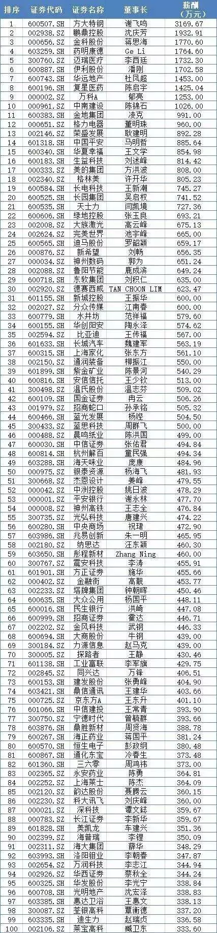 2018年A股上市公司董事長(zhǎng)年薪在500萬以上的有44位,1000萬以上的有10位。其中,2018年A股上市公司薪酬最高的為方大特鋼董事長(zhǎng)謝飛鳴,年薪為3169.67萬元。萊寶高科董事長(zhǎng)以333.60正好躋身第100名。