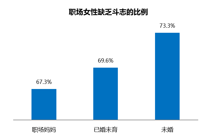 盡管來自生活和事業(yè)的雙重壓力較大,但是職場媽媽的職場斗志依然高昂。調(diào)查顯示,整體來看職場女性不加班的比例不足三成,職場媽媽群體的加班強(qiáng)度略僅低于其他女性職場人,有31.1%的職場媽媽不用加班。雖然職場的外部競爭環(huán)境壓力大,但職場媽媽奮斗拼搏的精神氣很高。調(diào)研顯示,職場媽媽"經(jīng)?;蚺紶柍霈F(xiàn)缺乏工作斗志"的比例最低,為67.3%;已婚未育排在次位;未婚女性人群中缺少斗志的占比高達(dá)73.3%。