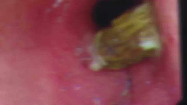 卡著一顆棕色核樣異物,