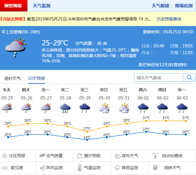 記者從深圳市氣象臺獲悉,25日大部分時間以陰天間多云為主,有短時陣雨或雷陣雨,局部地區(qū)雨勢較大,短時陣雨大概率出現(xiàn)在中午之后;氣溫25-29℃,中午時段體感相對較熱;南風清勁,沿海和高地最大陣風6-7級;相對濕度70%-95%,空氣濕度較大,略顯悶熱。26-27日多云為主,有短時(雷)陣雨,局部地區(qū)雨勢較大;展望28日前后有一場強雷雨過程。