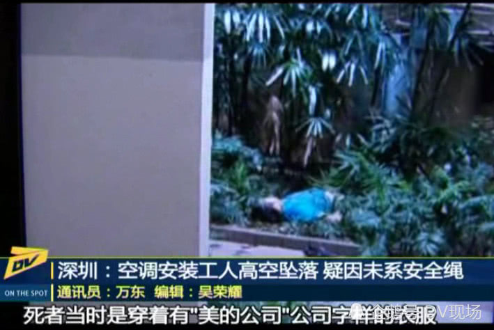 從拍攝的視頻可以看到,死者當(dāng)時是穿著有"美的公司"公司字樣的衣服,目擊者說,死者是在13樓安裝空調(diào)外機(jī)時出事的。