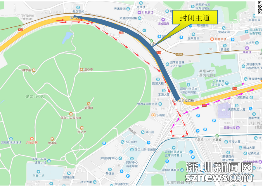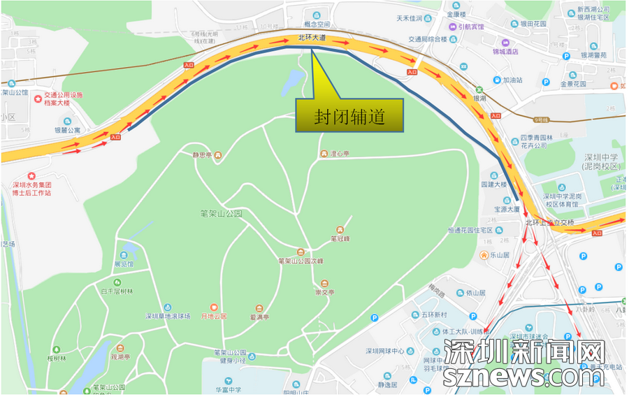 夜間封閉北環(huán)大道主道時,主道車輛合流至輔道2車道直行至上步北路經(jīng)羅湖、鹽田右轉出口匝道后往泥崗西路東行或擇周邊其他道路通行;而夜間封閉北環(huán)大道輔道時,輔道車輛合流至主道3車道直行至上步立交處右轉輔道臨時出口,車輛可選擇臨時開設出口或周邊其他道路通行。