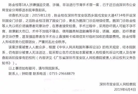 最近,寶安區(qū)人民檢察院就發(fā)布了一起案件公告,當(dāng)中顯示寶安區(qū)西鄉(xiāng)鵬深門診在病患接受檢查、手術(shù)治療過程中,為獲取不法利益,采用“惡意夸大病情、故意割大傷口及使用器具制造疼痛”等手段,誘騙、威脅、恐嚇患者多交治療費,近日鵬深門診18人被起訴。