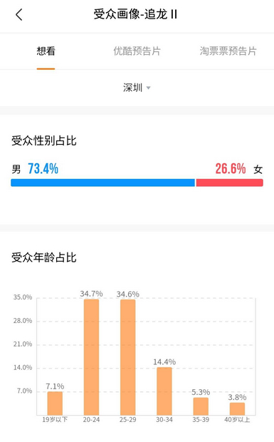 阿里影業(yè)旗下的燈塔專業(yè)版數(shù)據(jù)中顯示,深圳影迷在《追龍2》的受眾畫像男性占比73.4%,遠(yuǎn)高于女性,且在受眾年齡占比當(dāng)中,20-30歲群體是主要受眾群。