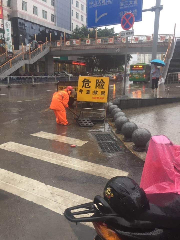 市城管部門已加派工作人員,加班加點,打開華怡路口等易澇點井蓋并設置警示牌,加大對市區(qū)排水的力度。