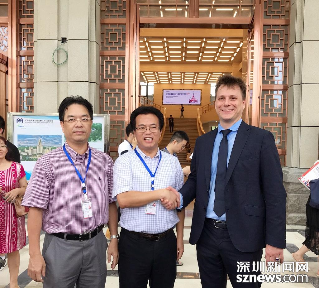 左起:深北莫黨委書記、副校長陸萬偉,深北莫代理校長唐水源及副校長阿列克謝·塔拉索夫合照
