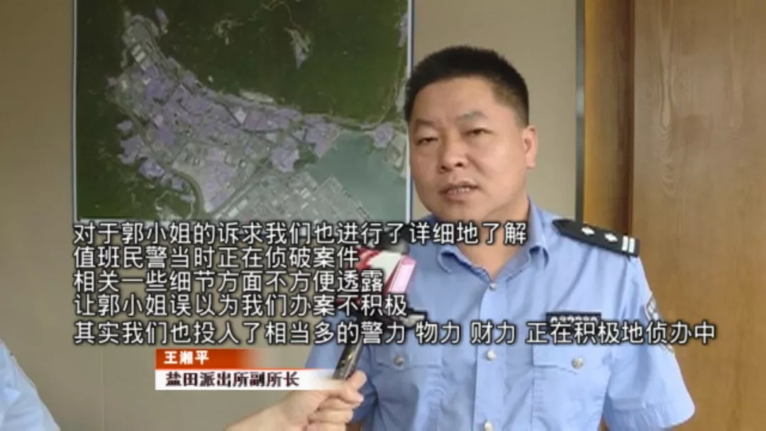 派出所表示,案件正在偵查當(dāng)中記者也和郭女士來到鹽田派出所,由于負責(zé)此案的蔡警官正值休假,派出所的一位值班領(lǐng)導(dǎo),對郭女士當(dāng)時所遭遇的處境,進行了情況說明。
