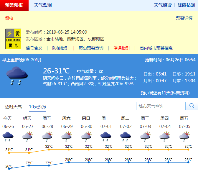 深圳新聞網(wǎng)2019年6月26日訊 24日夜間到25日白天,我市陰天間多云,有小到中雨,局部大雨,最大累計雨量43.1毫米,出現(xiàn)在石井街道金龜站;早晨最低氣溫24-25℃,白天最高氣溫30-31℃;相對濕度70%-95%;西南風(fēng)2-3級,最大陣風(fēng)5-6級;24日晚雨時能見度普遍在1-2公里,白天能見度上升到10公里以上。