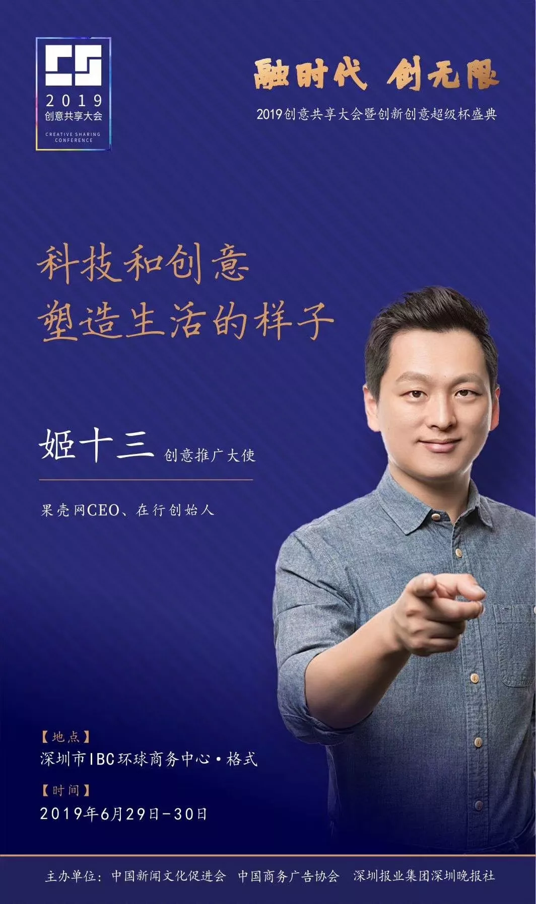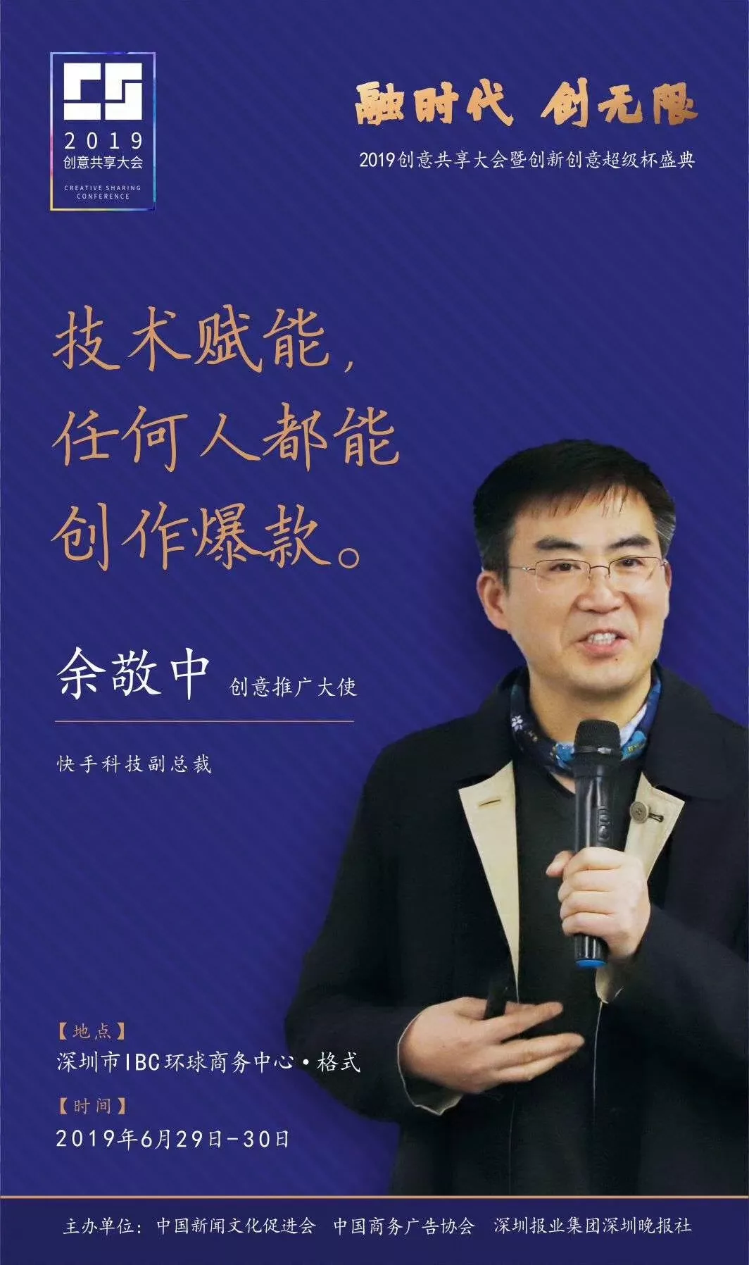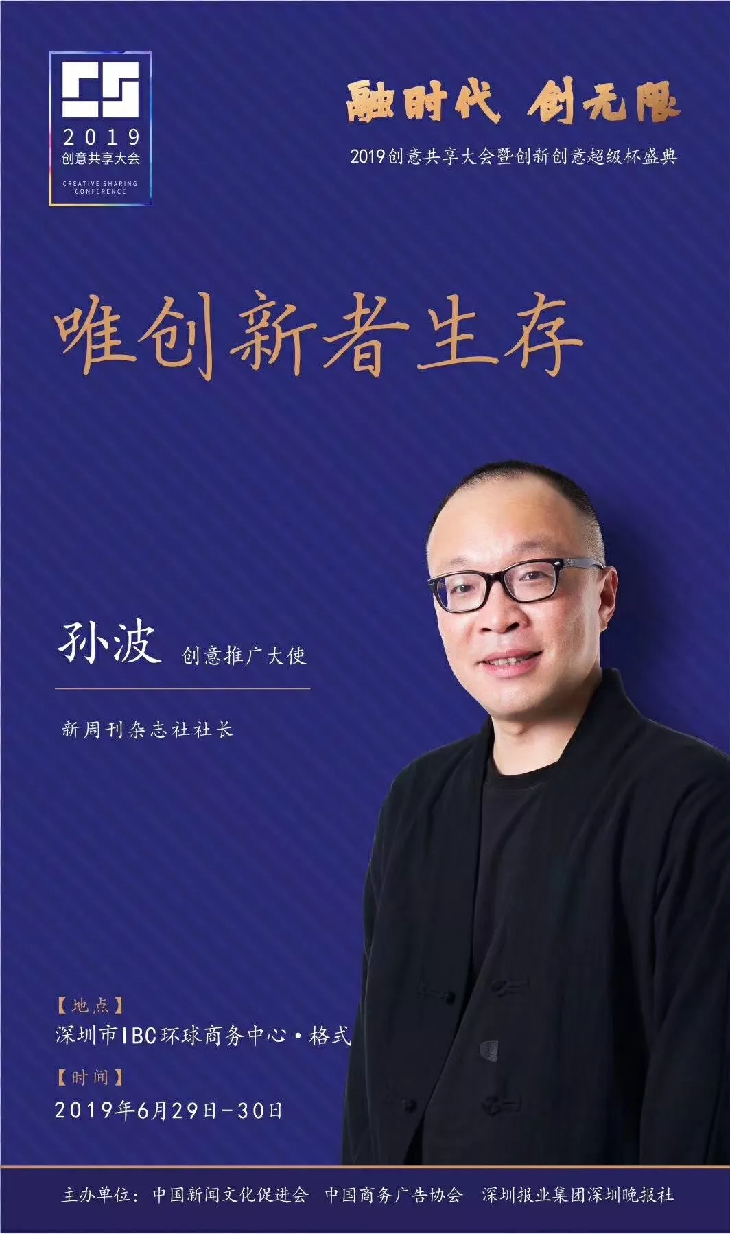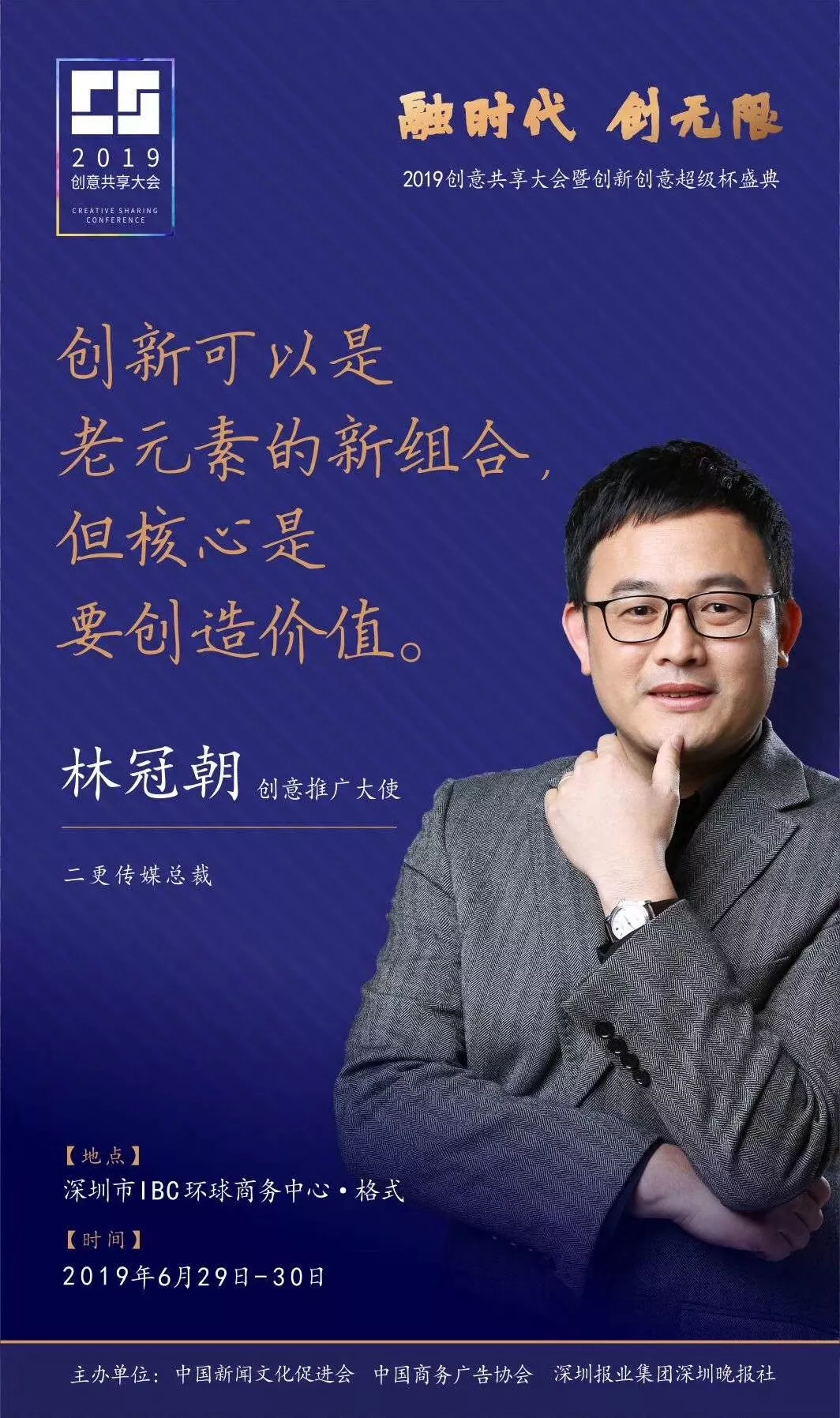 為了展現(xiàn)創(chuàng)意中國的精神風(fēng)貌和創(chuàng)意傳媒的文化力量,構(gòu)建創(chuàng)新創(chuàng)意共同體,擘畫美好圖景和未來趨勢,2019年6月29日至30日,由中國新聞文化促進(jìn)會(huì)、中國商務(wù)廣告協(xié)會(huì)、深圳報(bào)業(yè)集團(tuán)深圳晚報(bào)社等聯(lián)合主辦的“融時(shí)代創(chuàng)無限——2019創(chuàng)意共享大會(huì)暨創(chuàng)新創(chuàng)意超級杯盛典”將在深圳市IBC環(huán)球商務(wù)中心隆重舉辦。
