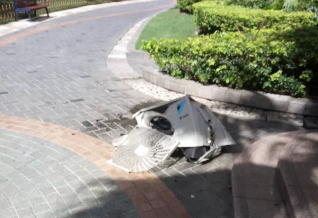 深廣電第一現(xiàn)場2019年7月1日訊 今天下午,福田區(qū)萬科金色家園小區(qū)一臺空調(diào)主機從11樓墜下!巨大的聲音把業(yè)主嚇得不輕?。?!空調(diào)外機應(yīng)該是固定好的怎么就會掉下來了?