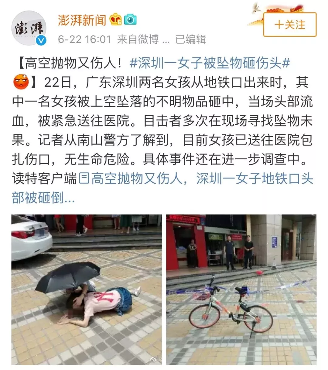 6月22日,一個女孩被高空墜下的杠鈴砸傷,目前仍在醫(yī)院治療。經(jīng)過調(diào)查,原因是有人在打掃衛(wèi)生時不慎將杠鈴鐵片從樓上墜落,于是釀成慘?。?/span>