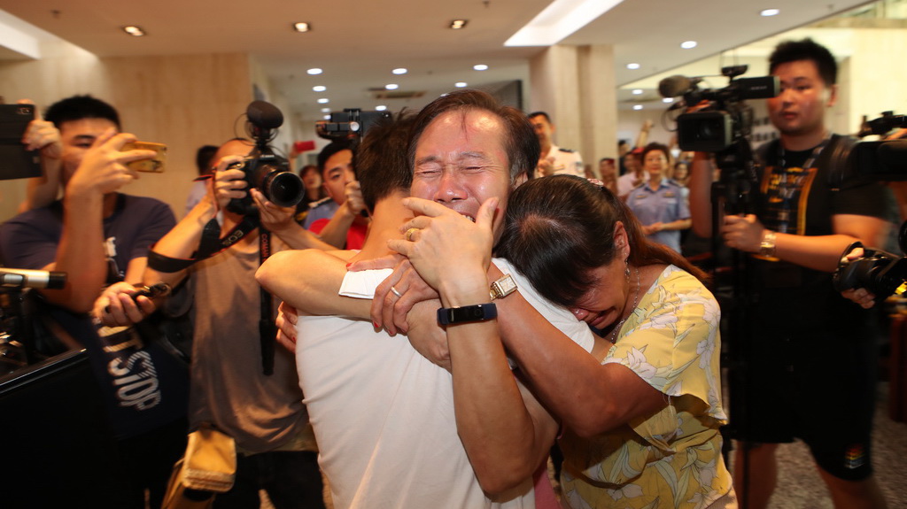 7、7月18日上午,在深圳市公安局刑事偵查局和福田分局的幫助下,尋子18年的余氏夫婦在深圳市刑偵局技術(shù)處一樓見(jiàn)到了兒子,團(tuán)聚現(xiàn)場(chǎng)余氏夫婦將兒子緊摟懷中,淚流滿面。
