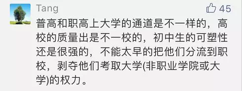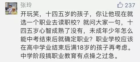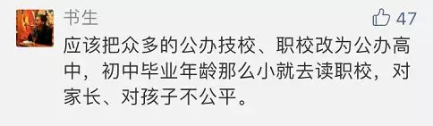 有網(wǎng)友表示:十四五歲的孩子行知尚未成熟,未成年少年無法在中考結(jié)束后就確定職業(yè),職業(yè)學(xué)校應(yīng)該在高中學(xué)業(yè)結(jié)束后滿18歲的孩子再考慮。中學(xué)階段搞職業(yè)教育有點操之過急。