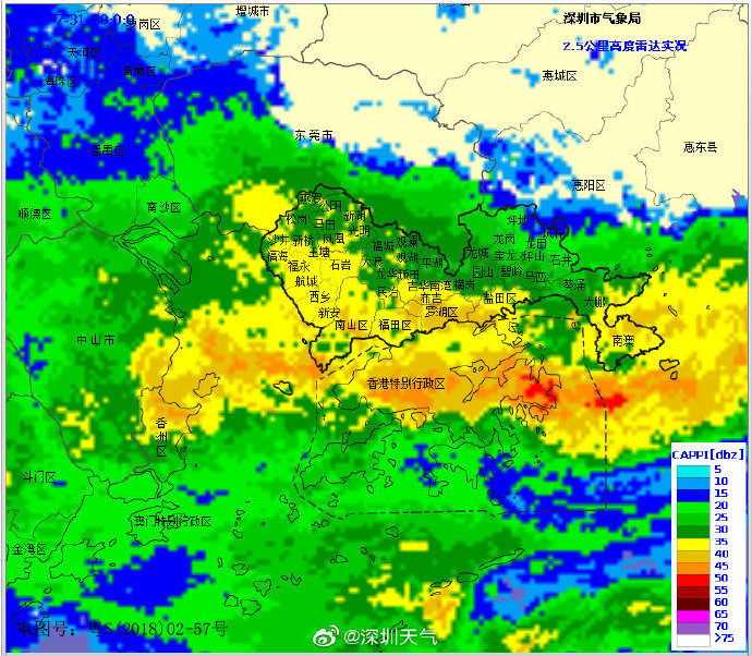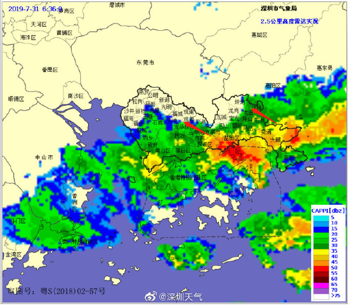 當(dāng)一條雨帶的長(zhǎng)軸和雨帶的移動(dòng)方向(箭頭)夾角很小時(shí),某個(gè)地方就會(huì)被這條雨帶幾乎從頭到尾地經(jīng)過,于是這個(gè)地方的累計(jì)雨量就會(huì)特別大。而現(xiàn)在深圳靠南的大部分區(qū)域就在經(jīng)歷一場(chǎng)列車效應(yīng),所以這場(chǎng)雨持續(xù)時(shí)間比較長(zhǎng),短時(shí)間內(nèi)停不下來。
