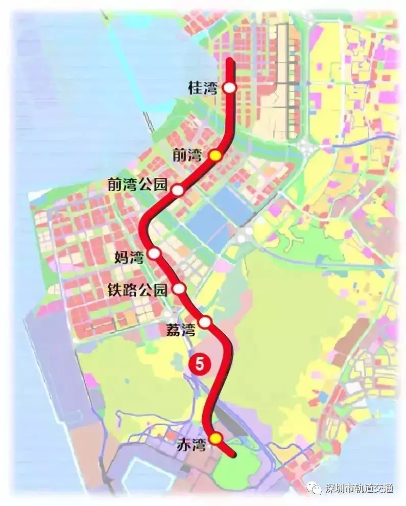 地鐵5號線南延段,即5號線二期工程,北起于5號線前海灣站,經前海、南山,終點與地鐵2號線赤灣站換乘。線路全長約7.7千米,全線采用地下敷設方式。該線路設站7座,分別為:赤灣、荔灣、鐵路公園、媽灣、前灣公園、前灣、桂灣。