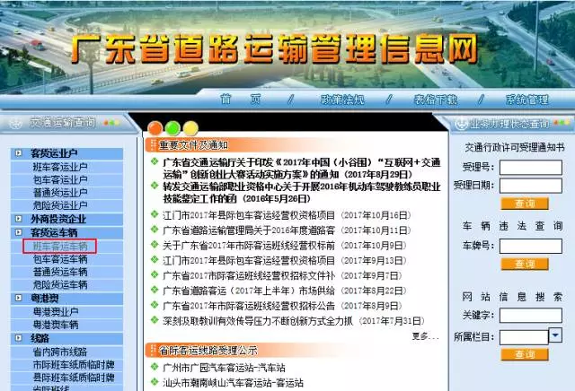 登錄廣東省道路運(yùn)輸管理信息網(wǎng),點(diǎn)擊左側(cè)菜單欄中的「客貨運(yùn)車輛」,再點(diǎn)擊「客班車客運(yùn)車輛」,就能進(jìn)入到查詢頁(yè)面。