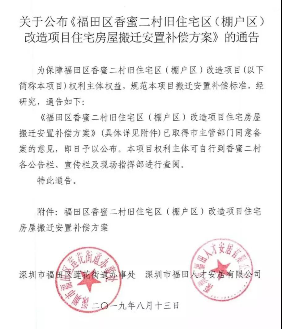 晶報2019年8月19日訊 8月13日,深圳市福田區(qū)蓮花街道辦事處和深圳市福田人才安居有限公司聯(lián)合發(fā)布"關(guān)于公布《福田區(qū)香蜜二村舊住宅區(qū)(棚改區(qū))改造項目住宅房屋搬遷安置補償方案》的通告"。