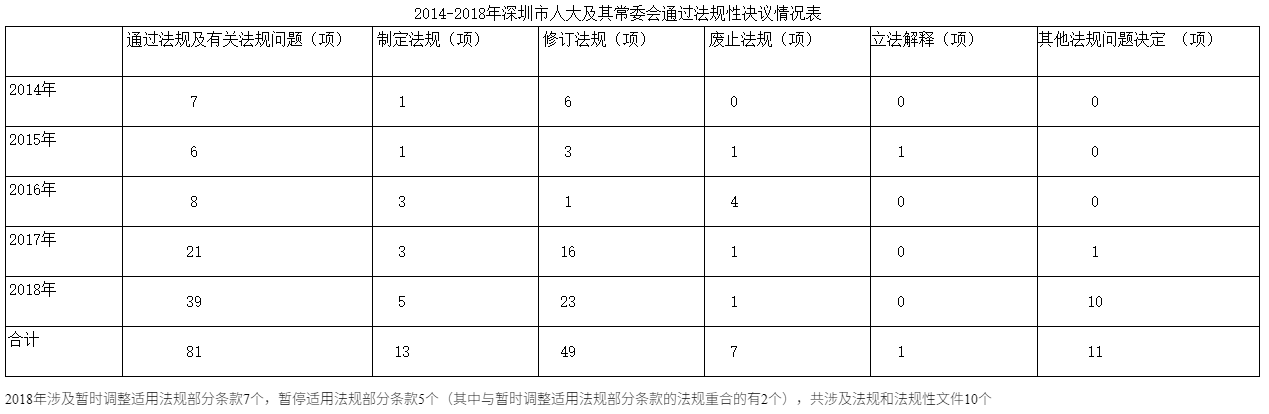 2018年,深圳在立法保障改革、立法推動改革、立法規(guī)范改革方面的步伐越邁越大,在加大特區(qū)立法權(quán)使用,制定特區(qū)條例促進(jìn)改革創(chuàng)新和保障經(jīng)濟(jì)社會發(fā)展外,根據(jù)改革的需要,及時修改和廢止與經(jīng)濟(jì)社會發(fā)展不相符的法規(guī),采用暫停法規(guī)性文件的適用、暫時調(diào)整和暫停法規(guī)部分條款適用的方式,為改革探索提供法治依據(jù)。全年通過新的特區(qū)條例5項,修訂法規(guī)23項,廢止法規(guī)1項,暫時調(diào)整和暫停適用法規(guī)10項。