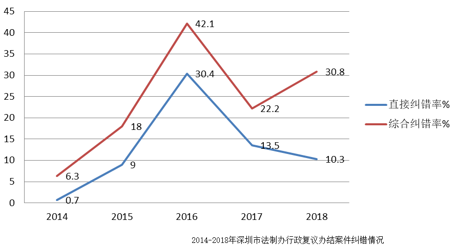 2018年深圳行政復(fù)議案件數(shù)量大幅減少,這可能與“兩隨機(jī)一公開”執(zhí)法全面推廣后執(zhí)法規(guī)范性進(jìn)一步提高和執(zhí)法爭議減少有關(guān)。辦結(jié)的行政復(fù)議案件中,被撤銷或確認(rèn)違法的案件比例繼續(xù)降低,但裁定終止的案件總件數(shù)雖略少于上年,比例卻有一定幅度上升。總體而言,行政復(fù)議的直接糾錯率有所下降,但間接糾錯率有所上升,較好發(fā)揮了行政復(fù)議對行政執(zhí)法的監(jiān)督作用。