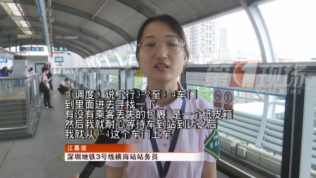 當(dāng)時(shí),一輛列車即將到達(dá)龍崗的橫崗站,站務(wù)員從3-4號門上車尋找。最終,站務(wù)員在列車座位下面找到了乘客遺失的紙箱,