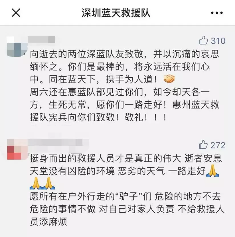 在深圳藍(lán)天救援隊(duì)微信留言中,有隊(duì)員悲痛惋惜隊(duì)友的離去,也有人質(zhì)疑驢友,明知惡劣天氣卻還要前往山野探險(xiǎn),這種行為是對自己對他人生命的不負(fù)責(zé)。