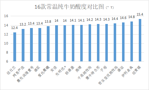 8款國(guó)產(chǎn)牛奶酸度在13~15°T之間。8款進(jìn)口牛奶中紐麥福全脂純牛奶的酸度15.4°T,紐仕蘭牧場(chǎng)全脂牛奶酸度12.4,其它6款也是13~15°T之間。其中,紐仕蘭、網(wǎng)易嚴(yán)選、晨光供港壹號(hào)、德亞酸度較低,表明新鮮度和熱穩(wěn)定性較好。