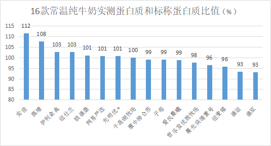 本次16款常溫純牛奶蛋白質(zhì)實(shí)際檢出值和標(biāo)稱值的比值在93%~112%,符合要求范圍。表現(xiàn)最好的是安佳、燕塘、伊利金典和紐仕蘭。德運(yùn)和德亞表現(xiàn)欠佳。