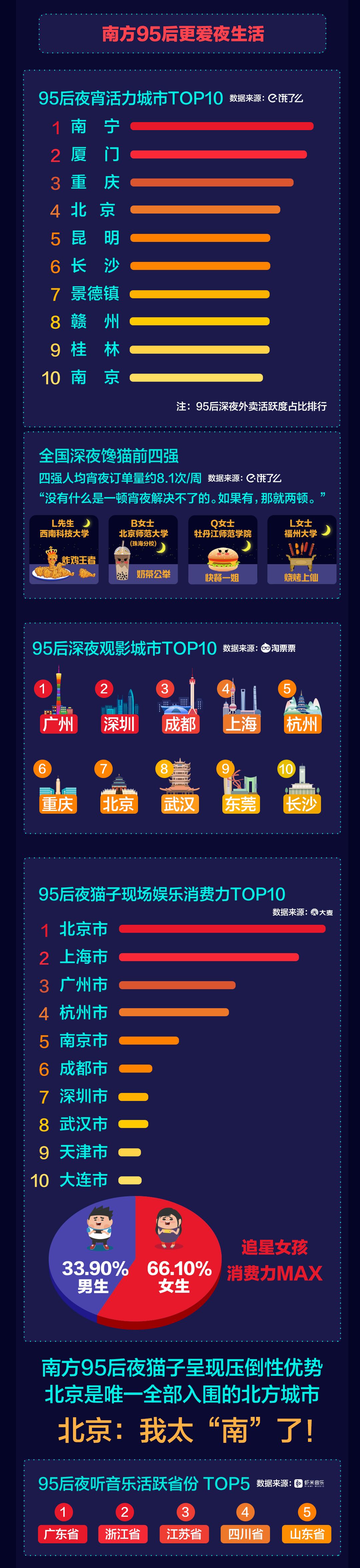 《95后夜貓子報(bào)告》綜合數(shù)據(jù)顯示,無(wú)論是觀影、追星、聽(tīng)音樂(lè),還是吃宵夜,南方95后夜貓子的活躍度都呈現(xiàn)壓倒性優(yōu)勢(shì)。95后宵夜活力城市TOP10、95后深夜觀影城市TOP10、95后夜貓子現(xiàn)場(chǎng)娛樂(lè)消費(fèi)力TOP10榜單里,入圍城市均以南方城市為主。