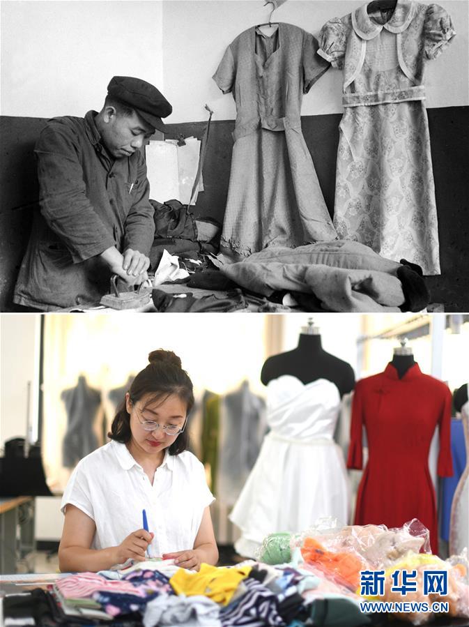 拼版照片:上圖為1957年,天津市縫紉供銷社職工在用舊大褂改制當時女性流行的服裝——“布拉吉”(俄語“連衣裙”的音譯)(新華社記者梁一丁攝);下圖為2019年6月20日,天津工業(yè)大學針織與針織服裝系教師匡麗赟在學校教室使用服裝企業(yè)廢棄的舊面料進行創(chuàng)作(新華社記者岳月偉攝)。