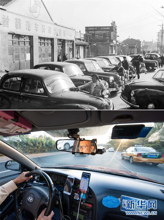 拼版照片:上圖為1965年,北京首都汽車公司職工在出租站擦洗汽車(新華社記者鄭震孫攝);下圖為2019年8月25日,北京新月聯(lián)合出租汽車公司司機(jī)穆懷東一邊運(yùn)送乘客,一邊通過網(wǎng)約車手機(jī)平臺接收訂單信息(新華社記者張笑宇攝)。