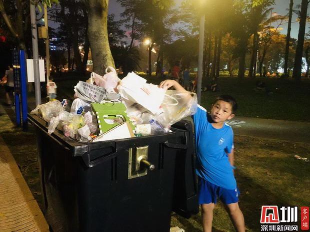10月1日晚上8:50分,深圳灣公園里,剛剛看完焰火晚會(huì)的孩子正將垃圾丟進(jìn)垃圾桶。