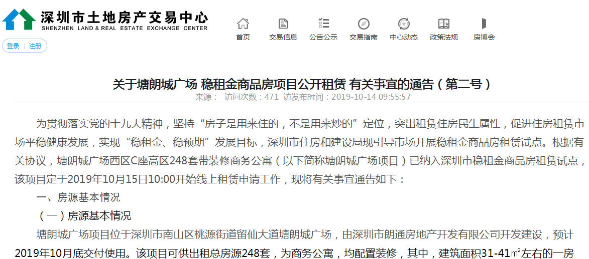 晶報2019年10月15日訊 怕房東亂漲價?怕租房合同不到期就趕人?穩(wěn)租金房來了!10月14日,深圳房地產(chǎn)交易中心官網(wǎng)發(fā)布了《關(guān)于塘朗城廣場穩(wěn)租金商品房項目公開租賃有關(guān)事宜的通告》,房源為南山區(qū)塘朗城廣場的248套帶裝修商務公寓,首批基準租金標準暫為110元/月?平方米,定于10月15日10:00開始線上租賃申請工作。