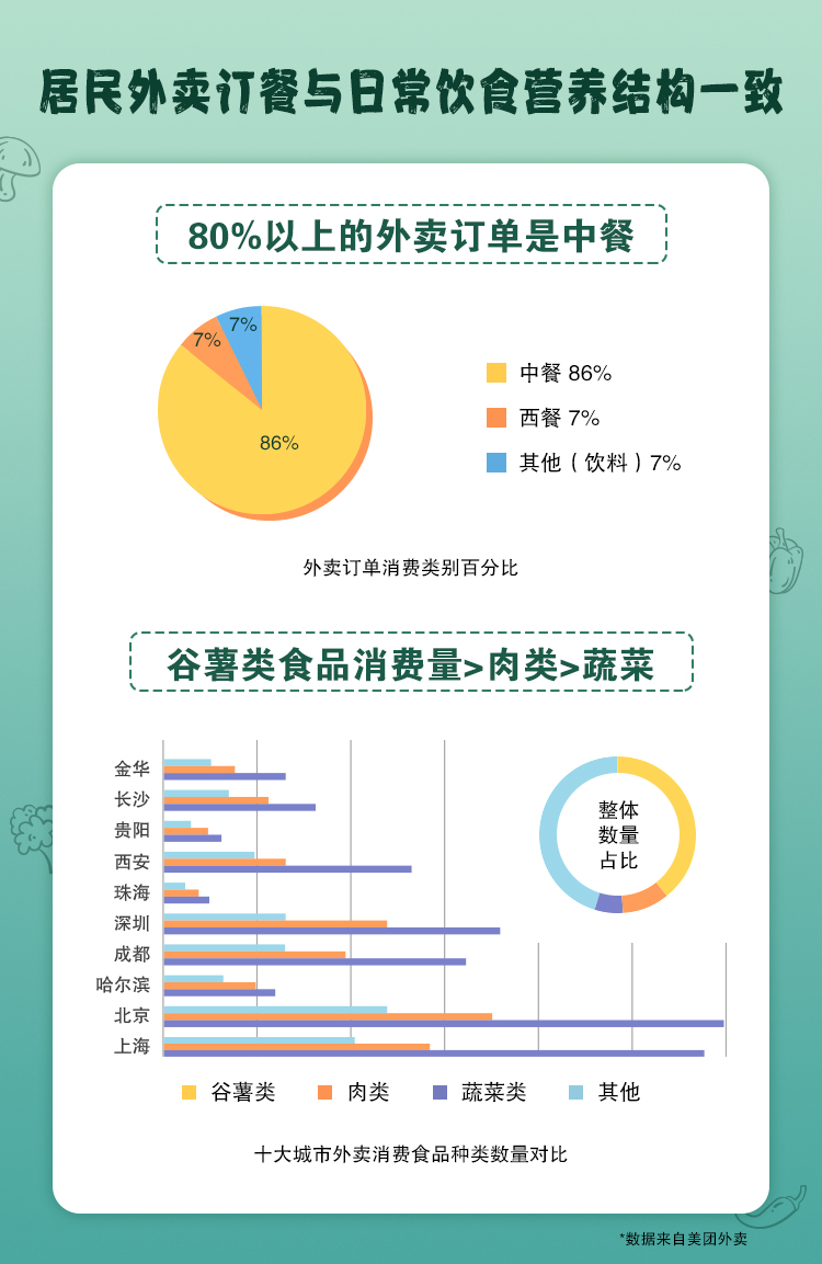 《我國10城市高頻外賣消費(fèi)菜品膳食結(jié)構(gòu)分析》報告研究指出十城市Top50消費(fèi)菜品中,排第一的均為米飯,深圳居民對米飯及米制品的喜愛全國排名第一;十城中,油條在所有城市都進(jìn)入了Top50;深圳和上海市民早餐最愛油條;珠海、哈爾濱居民尤其偏愛肉類食品,在訂制純?nèi)忸愂称返念l次,哈爾濱城市排名最高,谷薯類食品對哈爾濱居民的吸引力比全國其他城市低;西安、北京更愛選擇主食和菜肴搭配,北京居民對肉類食物的興趣度比全國其他城市低。此外,整體來看,最受歡迎的肉類是豬肉、雞肉、牛肉,最受歡迎的蔬菜是白菜、包菜、西紅柿。