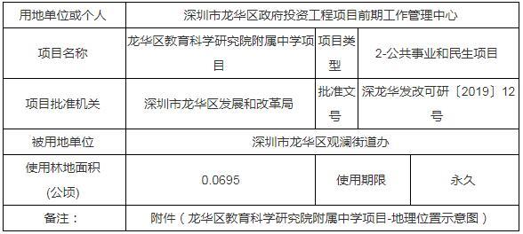 公示內(nèi)容顯示,龍華區(qū)教育科學(xué)研究院附屬中學(xué)擬使用林地面積0.0695公頃。