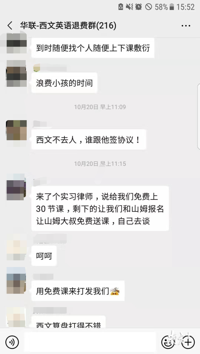 退費(fèi)群里的周女士介紹,10月20日,西文英語提供了一份“英語培訓(xùn)課程三方協(xié)議書”,但上面很多條款都沒有寫清楚。西文英語委托的律師稱,山姆大叔少兒英語愿意給西文英語的學(xué)員免費(fèi)提供30節(jié)課程,但學(xué)員在西文英語其他剩余課時(shí)的解決方案,需自行和山姆大叔協(xié)商。