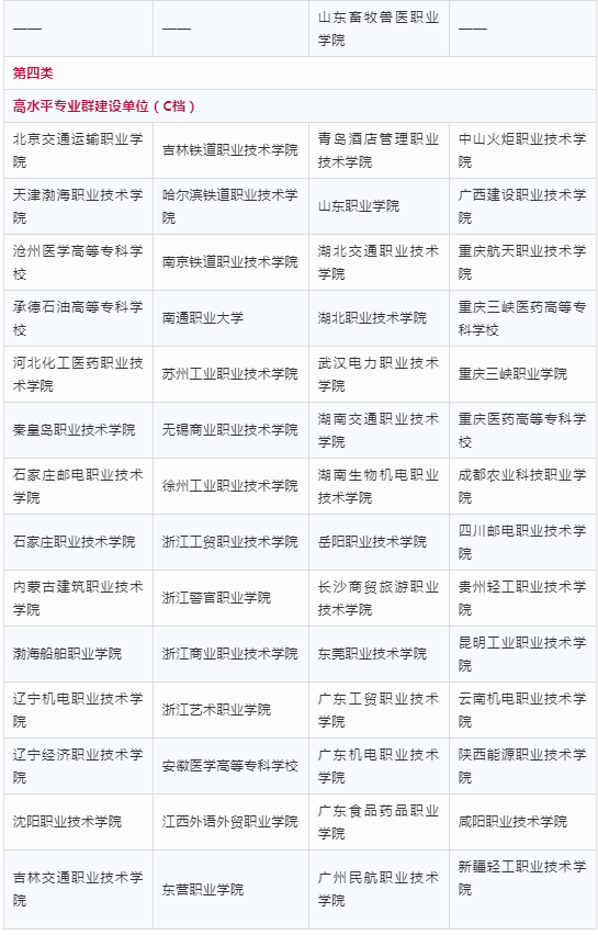 入圍“雙高計劃”的高職院校分為四類,其中第一類包括高水平學校建設單位(A檔)10所;第二類包括高水平學校建設單位(B檔)20所;第三類包括高水平學校建設單位(C檔)26所、高水平專業(yè)群建設單位(A檔)26所、高水平專業(yè)群建設單位(B檔)59所;第四類包括高水平專業(yè)群建設單位(C檔)56所。