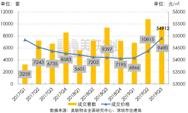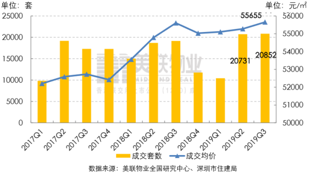 2019年第三季度二手住宅市場(chǎng)延續(xù)第二季度成交熱度,共備案20852套二手住宅,再創(chuàng)三年來季度成交量新高,較今年第二季度上升0.6%,同比去年第三季度上升8.9%;總成交面積約173.80萬㎡。美聯(lián)物業(yè)(深圳)藍(lán)籌住宅價(jià)格方面,今年第三季度全市二手住宅的成交均價(jià)為55655元/㎡,較第二季度上漲0.7%,同比去年第三季度上漲0.1%。
