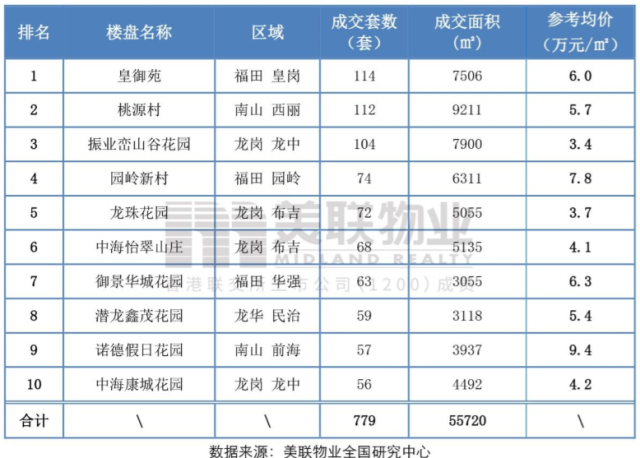 不過,與新房市場(chǎng)不同的是,二手住宅成交分布比較均勻。在第三季度二手住宅成交TOP10中,前三甲分別來自福田、南山和龍崗三區(qū)。其中,福田皇崗片區(qū)的皇御苑以114套的成交量位居榜首。