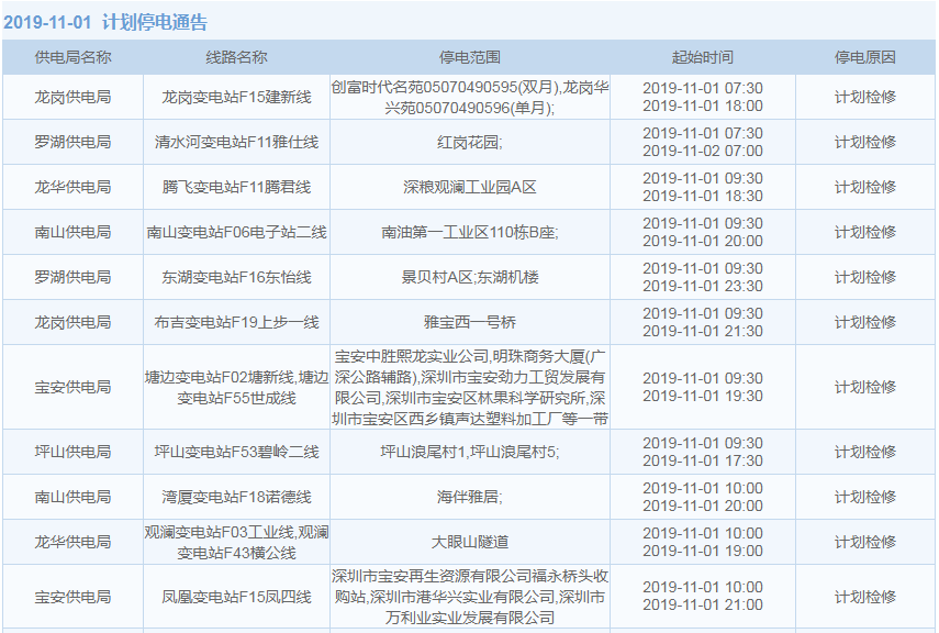 2019年10月29日訊 據(jù)中國南方電網(wǎng)最新消息:11月1日至11月15日,深圳這些地方將停電!快來看看有沒有你家的吧。