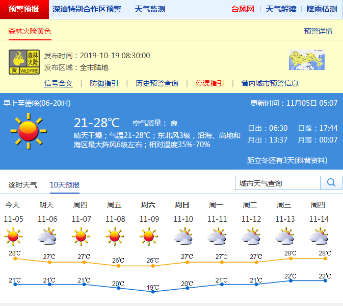 見圳客戶端·深圳新聞網(wǎng)2019年11月5日訊 深圳市氣象局預(yù)計(jì)5日晴天干燥;氣溫21-28℃;東北風(fēng)3級,陣風(fēng)6級;相對濕度45%-75% 。6-10日多云到晴天,空氣干燥,沿海、高地和海區(qū)最大陣風(fēng)可達(dá)7級左右,氣溫小幅波動(dòng),1字頭氣溫或?qū)⒃佻F(xiàn)。