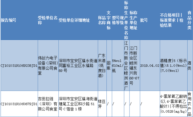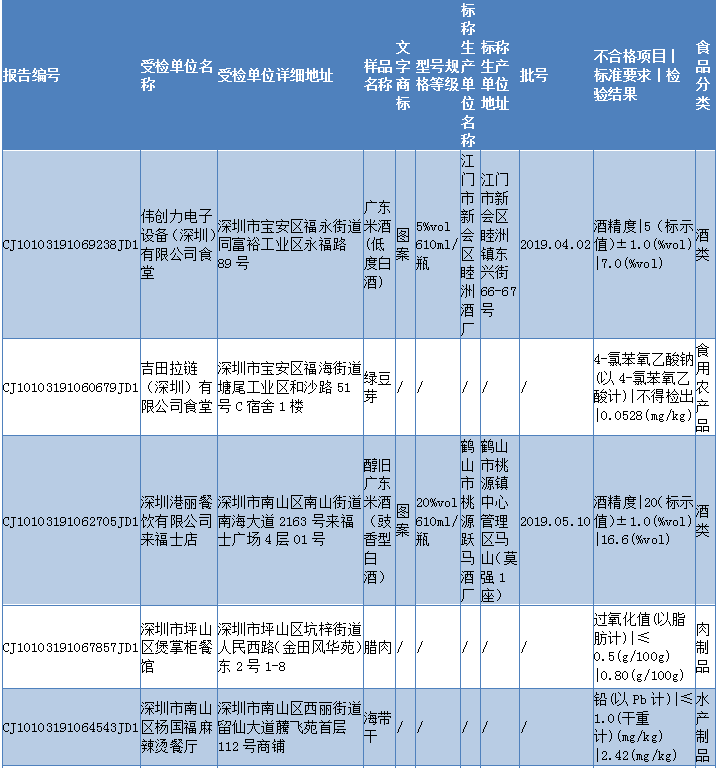 見圳客戶端 ·深圳新聞網(wǎng)2019年11月6日訊 11月5日,深圳市市場監(jiān)督管理局發(fā)布2019年第四十期食品安全抽樣檢驗情況通報,通報稱,深圳市市場監(jiān)督管理局于2019年8-9月組織對我市餐飲環(huán)節(jié)的食品開展了抽樣檢驗工作,本次共抽檢餐飲環(huán)節(jié)食品671批次,涉及餐飲環(huán)節(jié)經(jīng)營主體584家次,共檢測食品指標(biāo)3385項次。其中檢出不合格樣品12批次,涉及不合格食品類別有酒類2批次均為米酒;肉制品2批次為臘肉和臘鴨腿;食糖1批次、食用農(nóng)產(chǎn)品5批次牛蛙、豬肝等在列;蔬菜制品1批次、水產(chǎn)制品1批次。