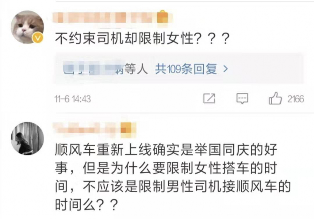 相較于其他安全措施,20:00后不接女性訂單的規(guī)定,引發(fā)的爭議尤其大。很多人覺得,這是對女性的冒犯和隱性歧視。因為有前車之鑒、怕出事后要擔(dān)責(zé),干脆讓女性無法方便地打車,屬于典型的因噎廢食。
