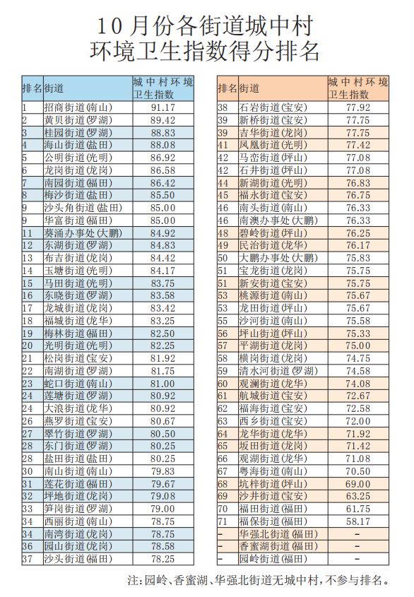 10月份深圳市環(huán)境衛(wèi)生指數(shù)為82.41分 龍華龍崗持續(xù)墊底