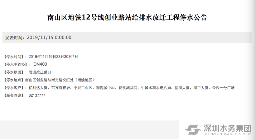 為配合南山區(qū)地鐵12號線創(chuàng)業(yè)路站給排水改遷工程,深圳水務集團計劃于11月19日23時20日7時,對南山區(qū)創(chuàng)業(yè)路與南光路交匯處DN400供水管道進行改遷碰口,屆時南油地區(qū)暫停供水。具體影響用戶為:億利達大廈、東方海雅居、中興工業(yè)區(qū)、南海城中心、現(xiàn)代城華庭、中國水利水電八局、怡海大廈、海王大廈、公園一號廣場。