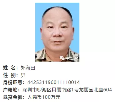 汕尾市公安局于11月11日發(fā)布的通告中,共有3人被懸賞通緝,分別是鄭海田(金額100萬)、唐偉杰(金額100萬)、洪水生(金額50萬)。