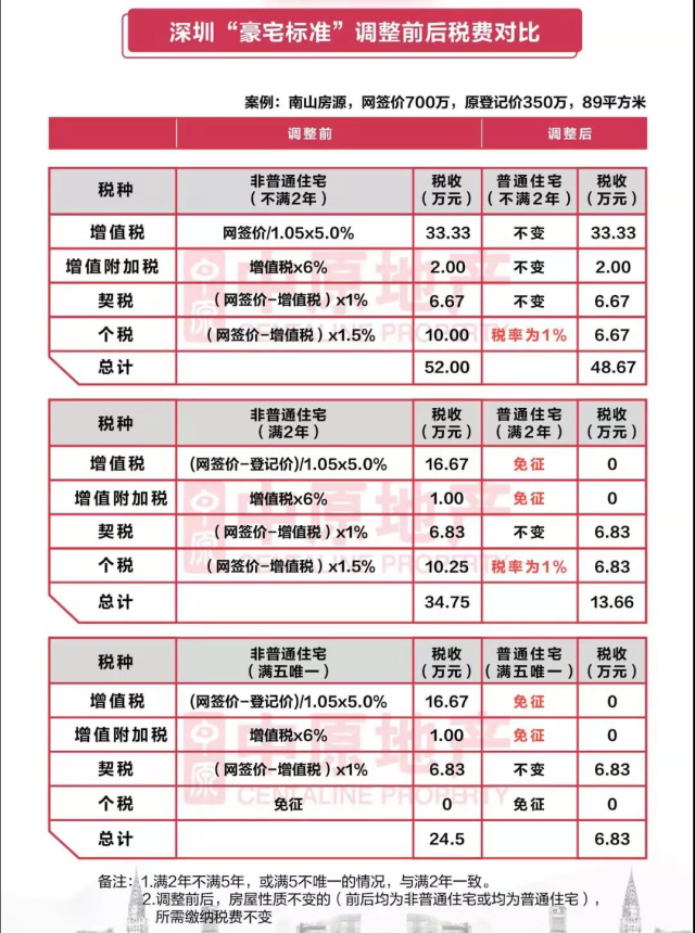 深圳“豪宅標(biāo)準(zhǔn)”調(diào)整前后稅費(fèi)對比。來自深圳中原研究中心