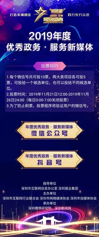 為盤點行業(yè)一年來取得的新探索、新成就、新經(jīng)驗,唱響主旋律,弘揚正能量,“‘圳能量’2019深圳網(wǎng)絡(luò)盛典”——暨深圳年度優(yōu)秀政務(wù)·服務(wù)新媒體活動將于2019年12月6日隆重舉行。